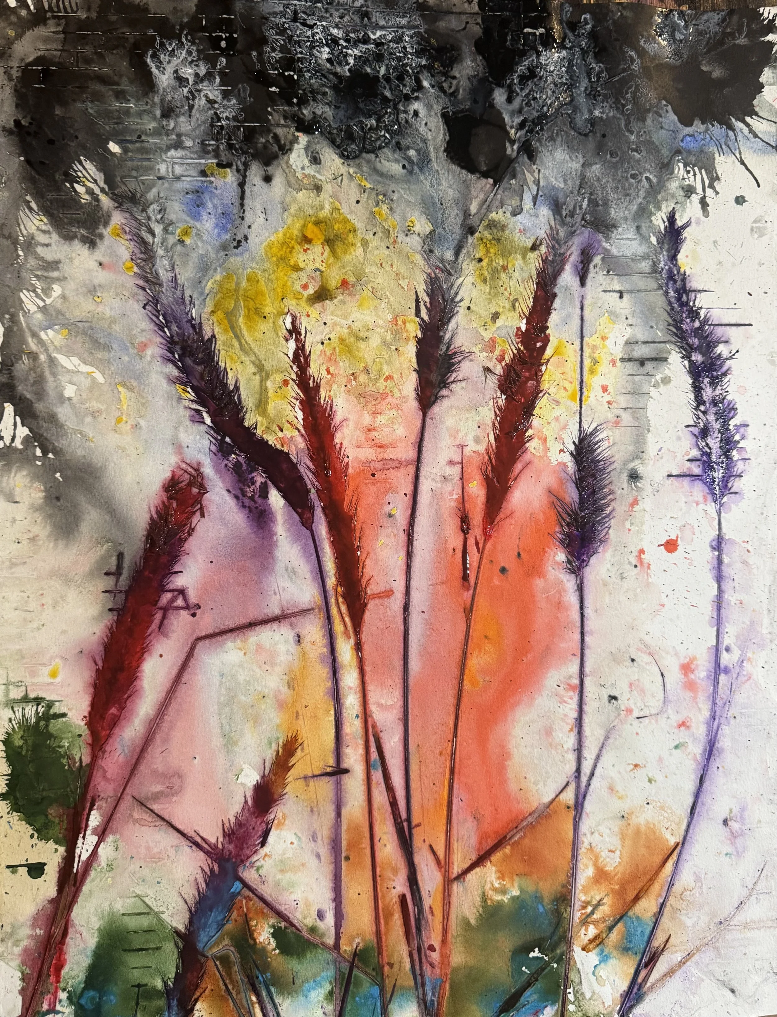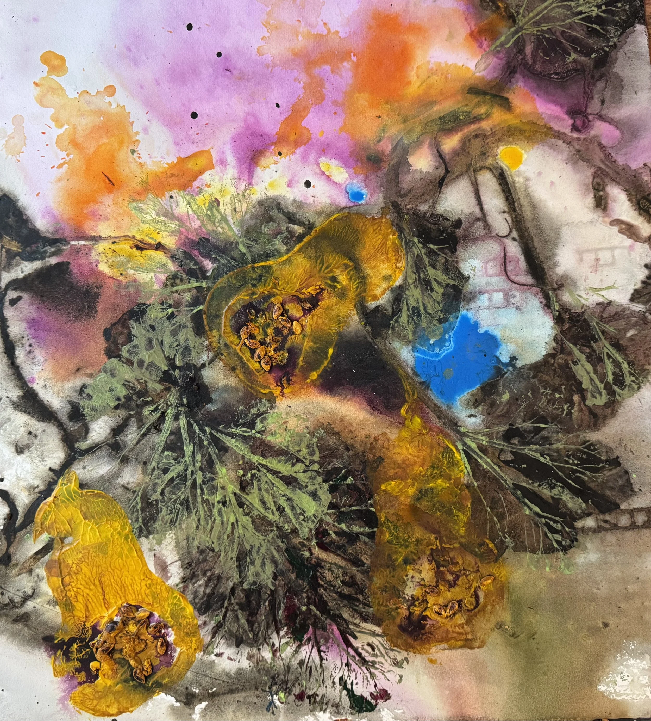 My work investigates the intersection of natural systems, chance, and control. Each piece begins with a wet surface, creating a receptive ground where movement and unpredictability are integral to the process. I use plants and found materials from the natural environment as tools to create impressions that reference growth, erosion, and organic structure.